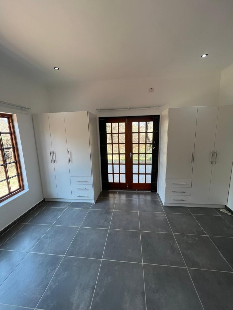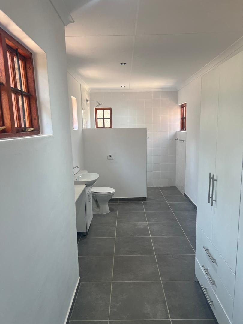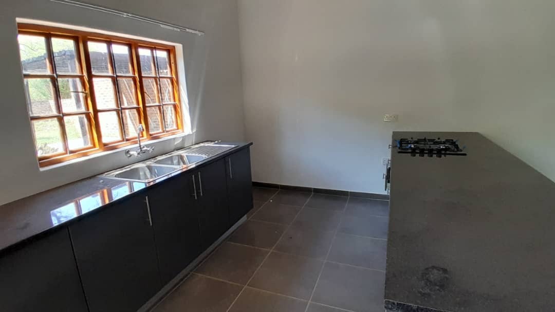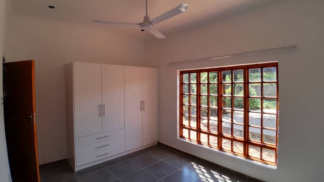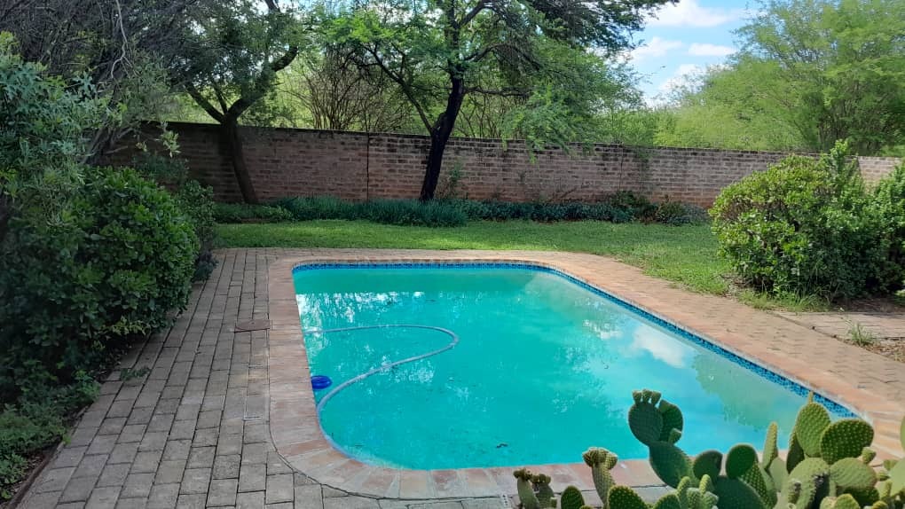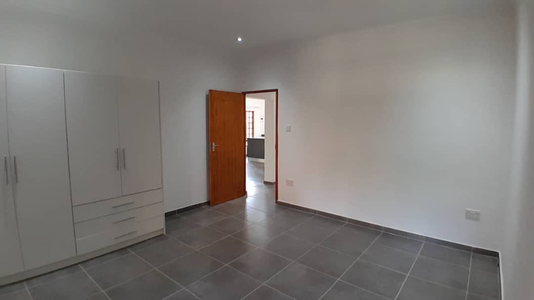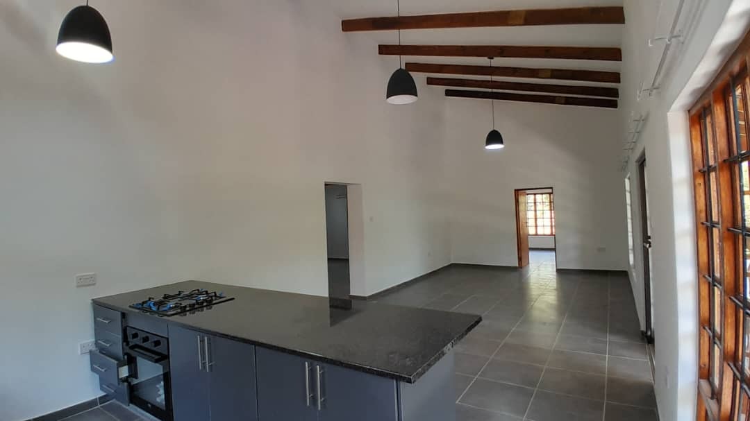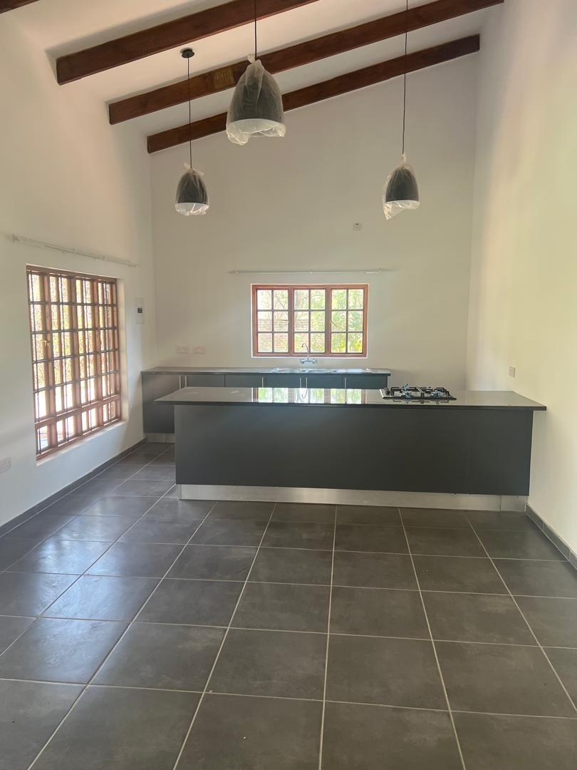 GABORONE NORTH: This modern 3-bedroom, 3-bathroom rental home is situated in Gaborone North, Gaborone. Each bedroom features an en-suite bathroom, ensuring privacy and comfort. The residence boasts a spacious, open-plan layout with high vaulted ceilings, exposed wooden beams, contemporary dark tiled flooring, and bright white walls. The kitchen includes a modern island with an integrated cooktop and ample white cabinetry. Enjoy the private swimming pool and patio area, perfect for relaxation. Security is enhanced with an access gate, electric fencing, a fully walled perimeter, and window security bars. Air cooling fans and built-in wardrobes complete this unfurnished property, offering a comfortable living experience.