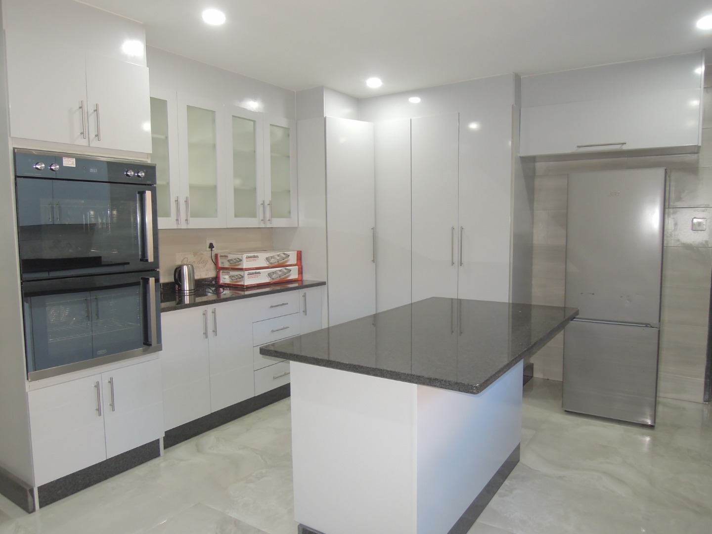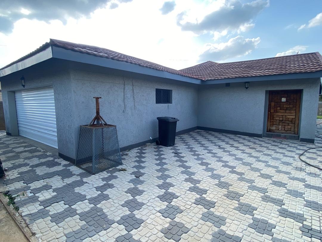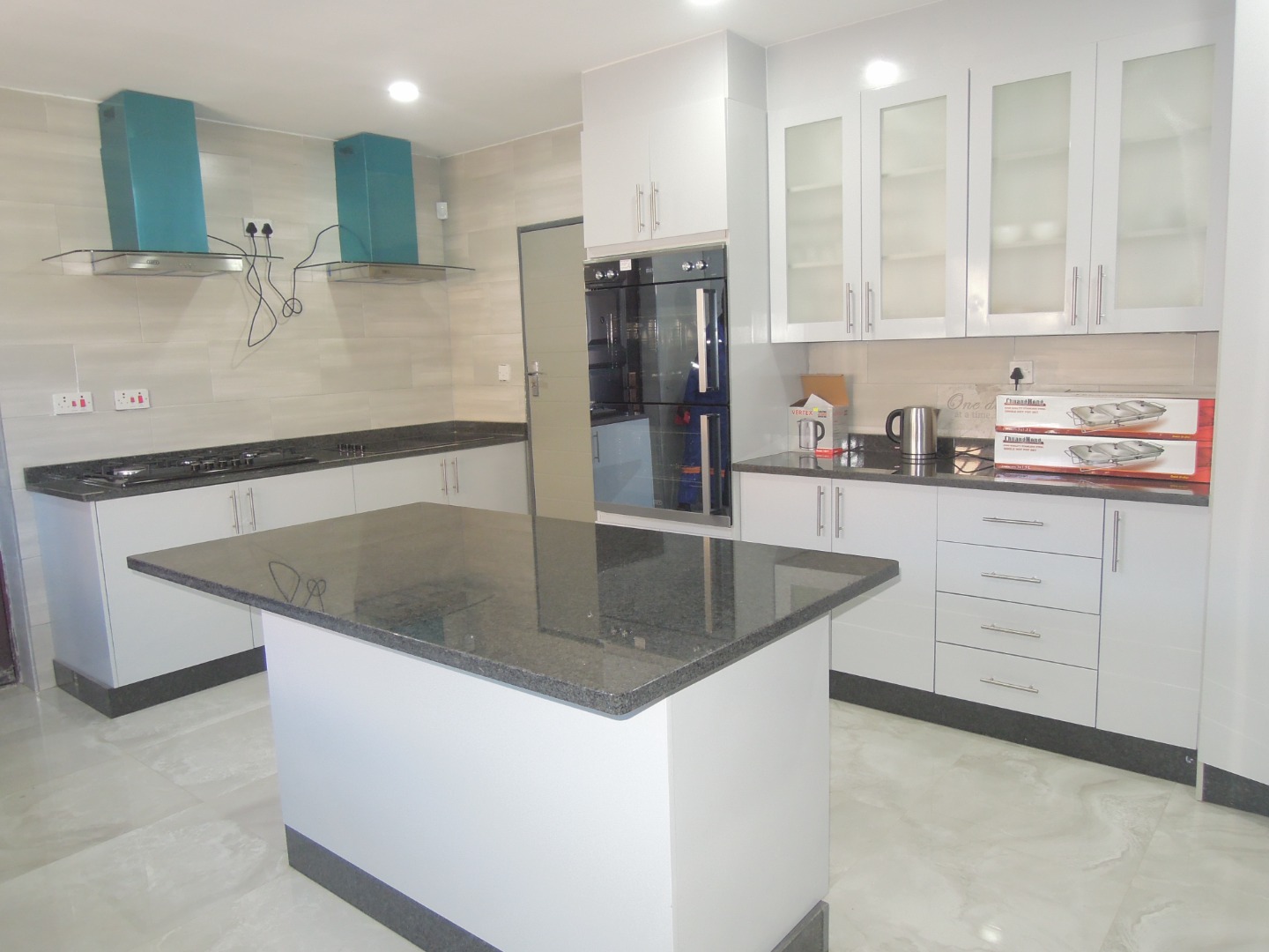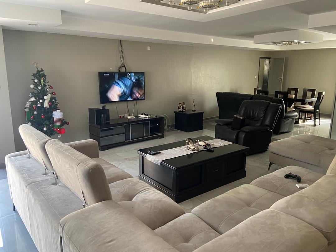 REMAX LISTING - BLOCK 9: The house features an open-plan living and dining area, a modern kitchen, three en-suite bedrooms, a laundry room, a separate toilet, and staff quarters. The kitchen is fitted with built-in cupboards, granite countertops, a stove with oven, and a stainless-steel double sink.