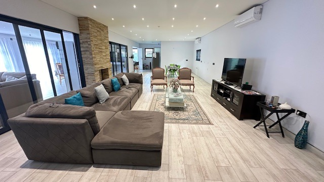 Step inside to an expansive open-plan interior, bathed in natural light from large sliding glass doors that seamlessly connect indoor and outdoor realms. The living spaces are adorned with modern tiled flooring, recessed lighting, and distinctive accent walls, creating an atmosphere of refined elegance. Entertain with flair in the dedicated entertainment area, featuring a built-in braai and pizza oven, perfect for hosting memorable gatherings.