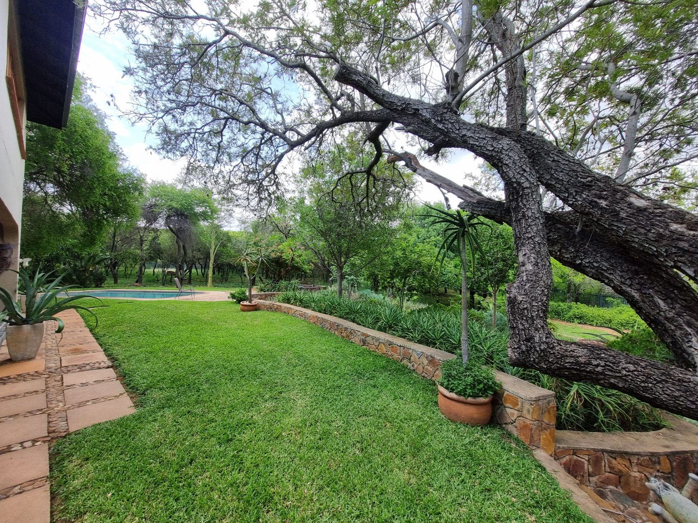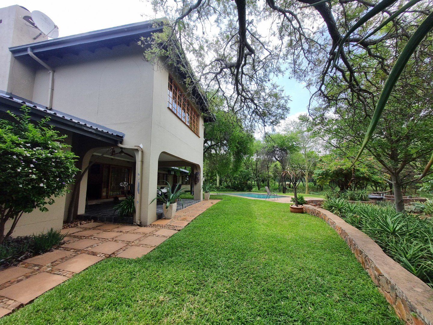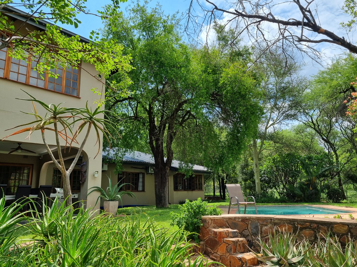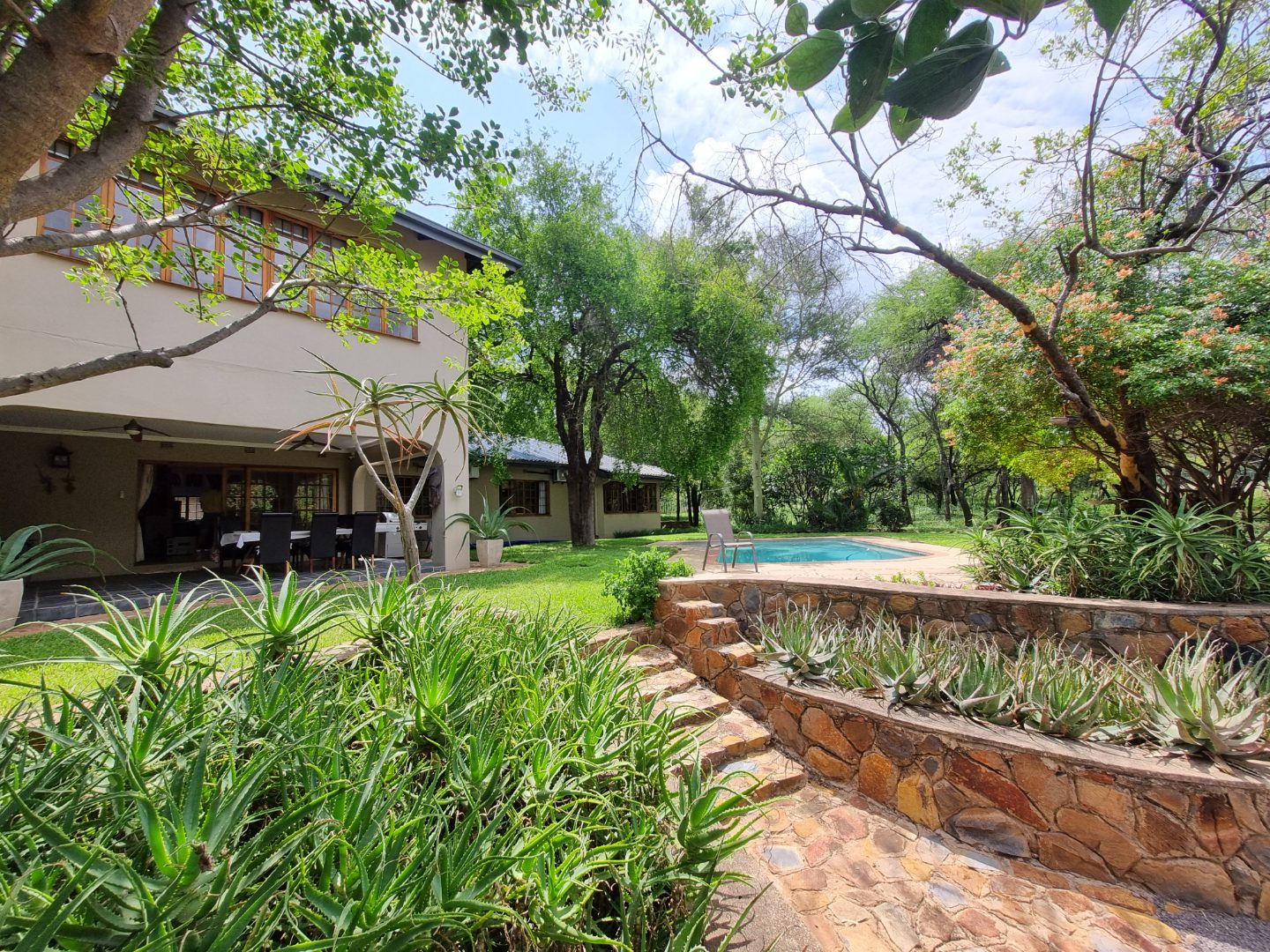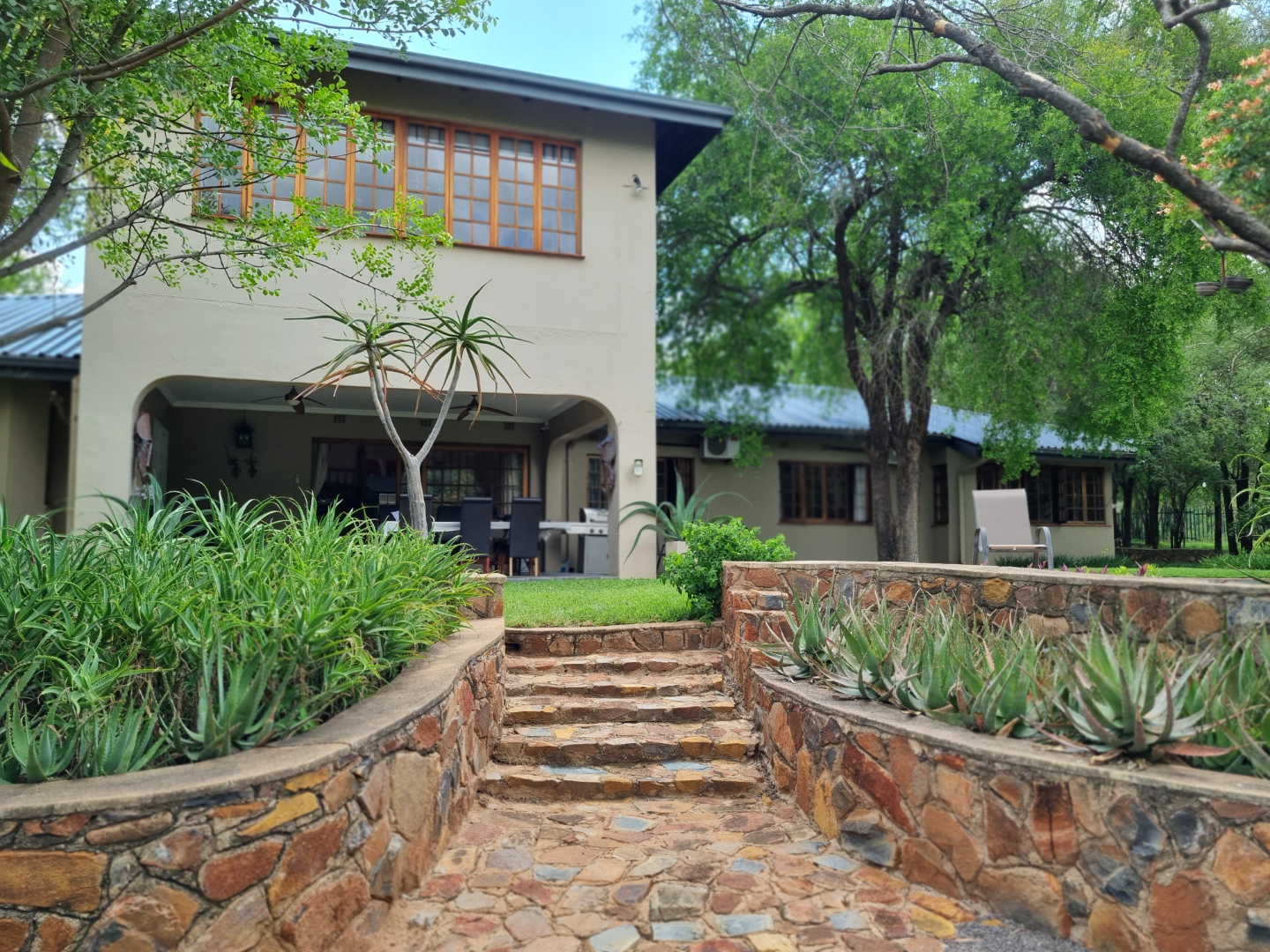 REMAX LISTING MOKOLODI 2 : Nestled within the esteemed Mokolodi 2, Gaborone, this magnificent 490 sqm residence, set on a sprawling 2.00-hectare plot, offers an unparalleled blend of rustic charm and sophisticated living. The property immediately captivates with its inviting covered entrance, featuring elegant stone-tiled steps and natural wood-framed doors and windows, all framed by lush, meticulously maintained gardens and mature trees that promise serene privacy and a picturesque kerb appeal.