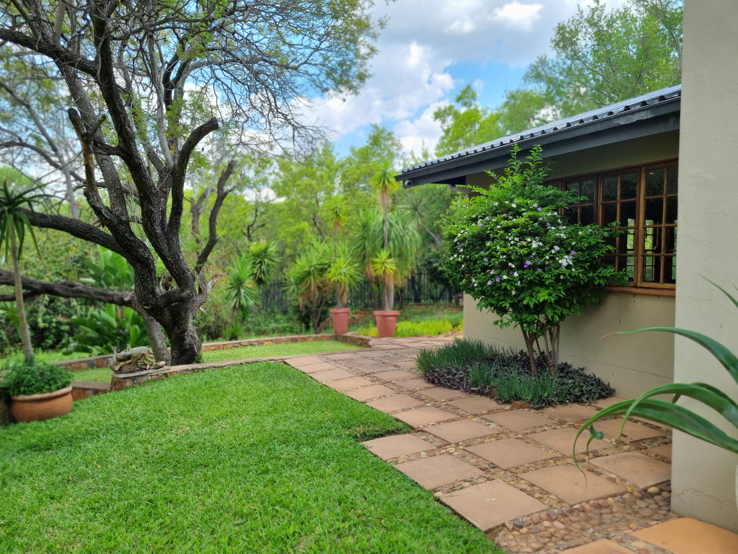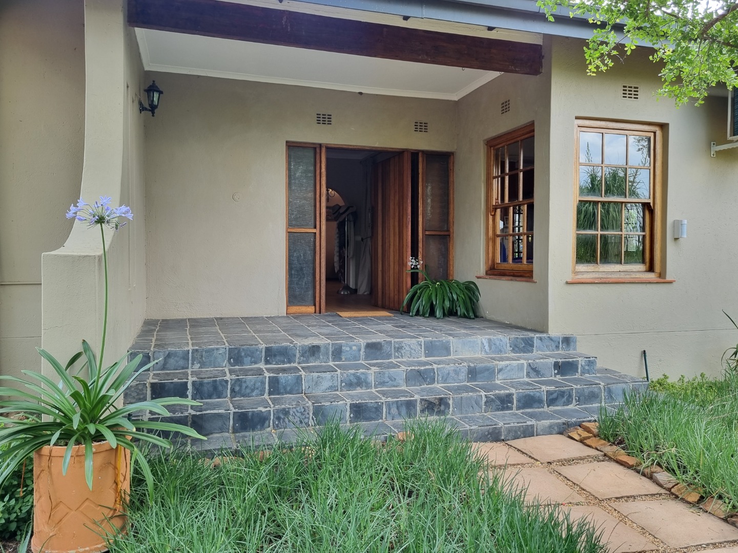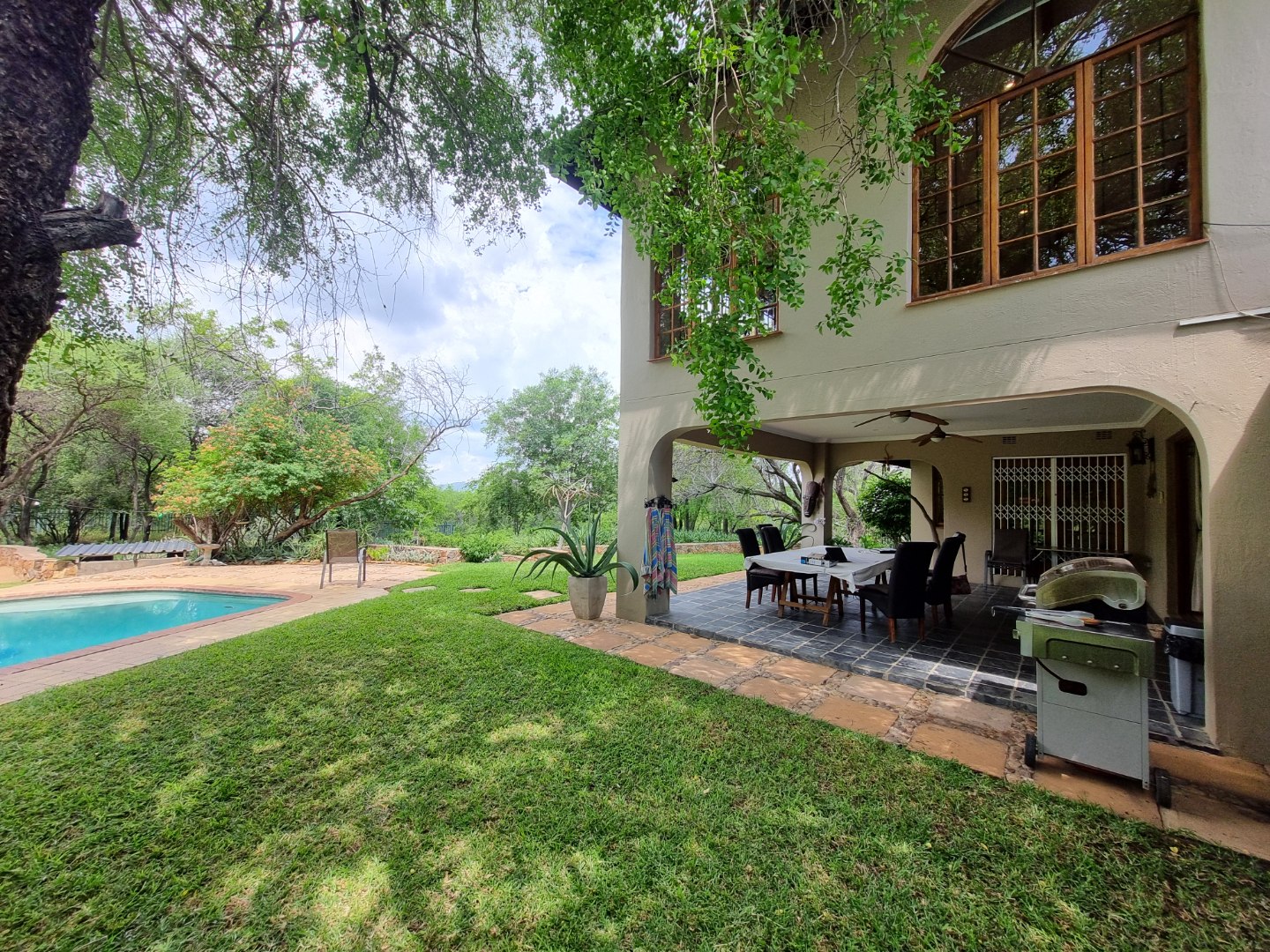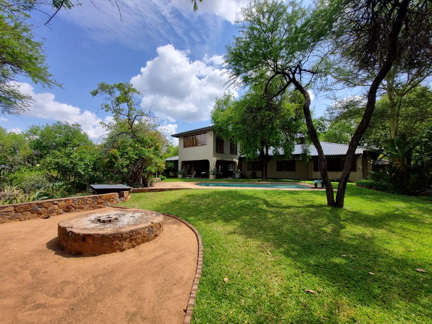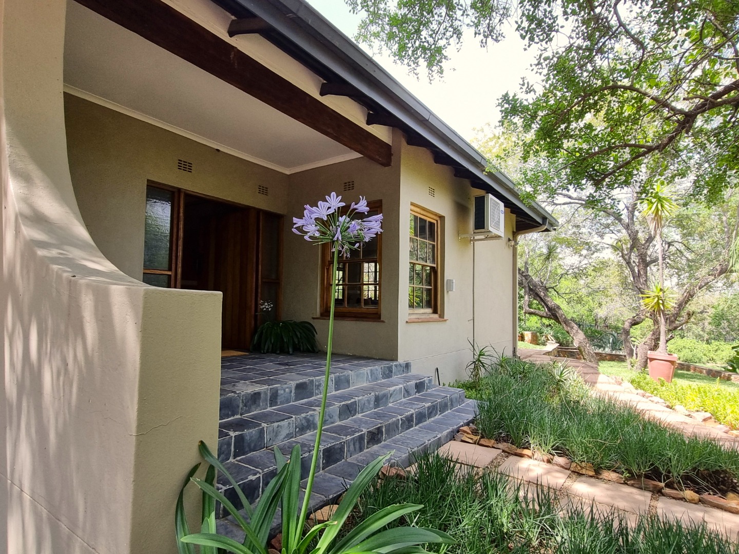 REMAX LISTING MOKOLODI 2 : Nestled within the esteemed Mokolodi 2, Gaborone, this magnificent 490 sqm residence, set on a sprawling 2.00-hectare plot, offers an unparalleled blend of rustic charm and sophisticated living. The property immediately captivates with its inviting covered entrance, featuring elegant stone-tiled steps and natural wood-framed doors and windows, all framed by lush, meticulously maintained gardens and mature trees that promise serene privacy and a picturesque kerb appeal.