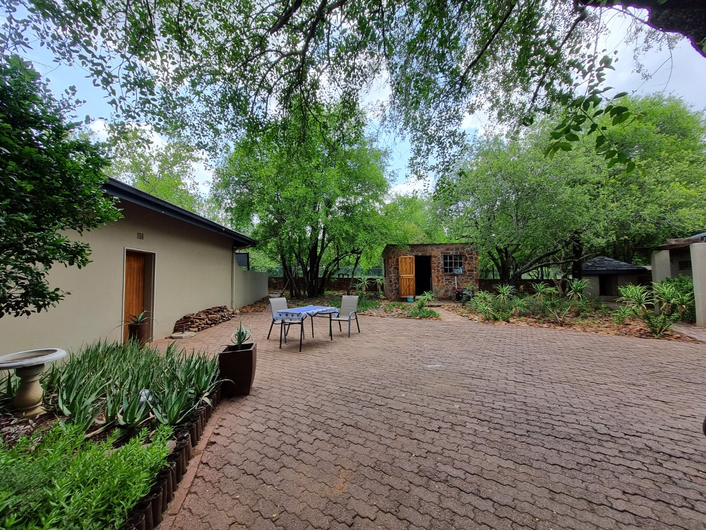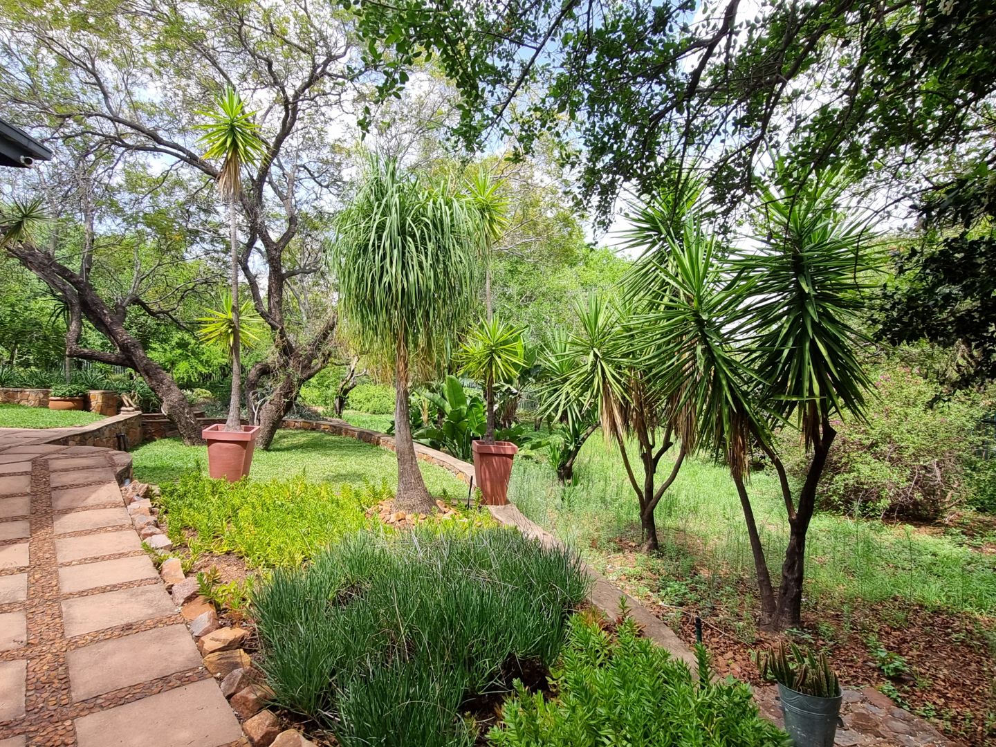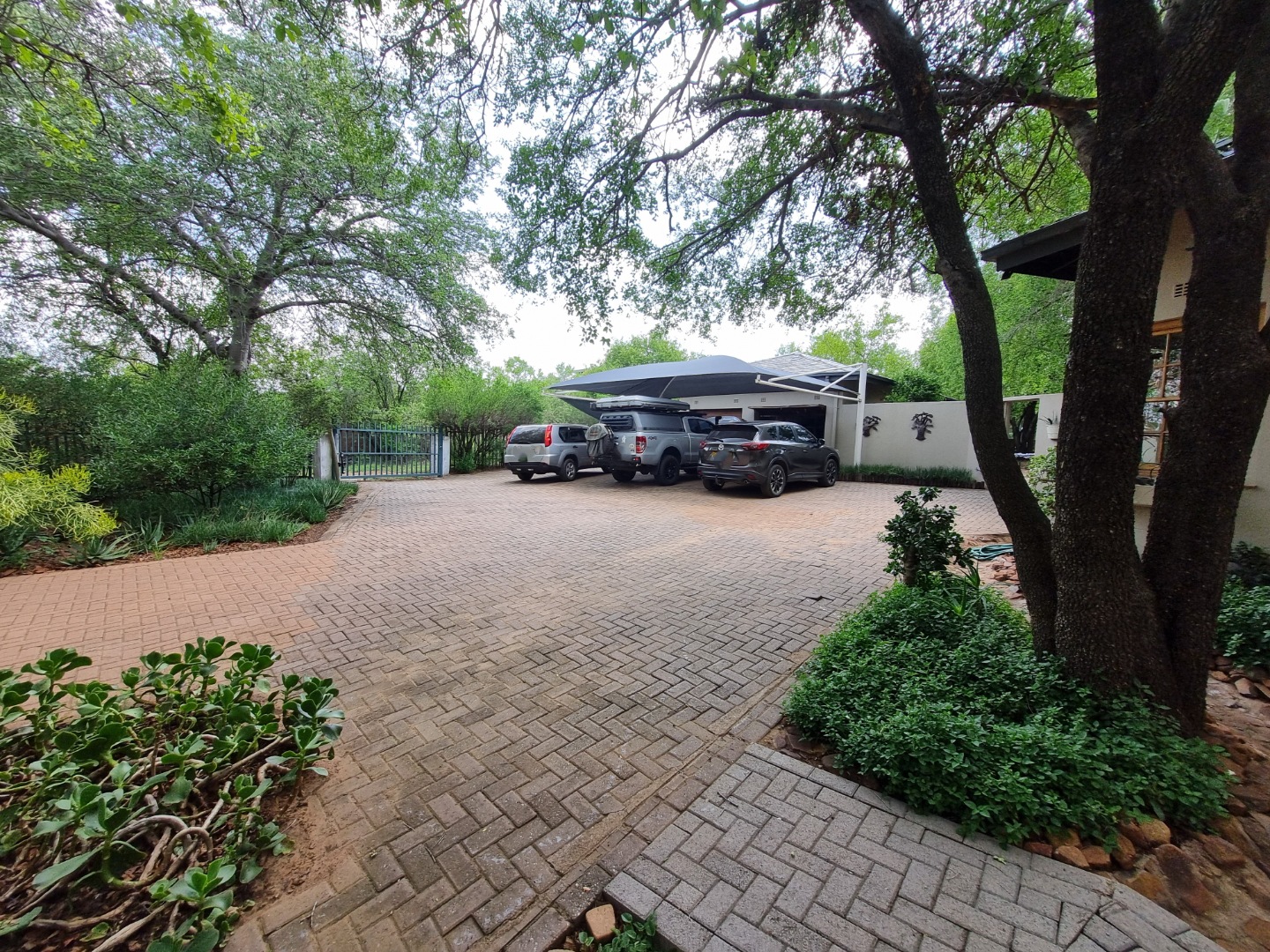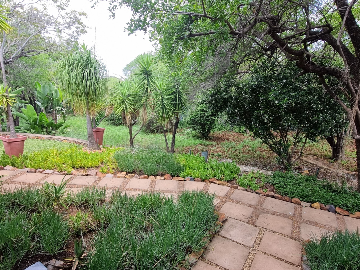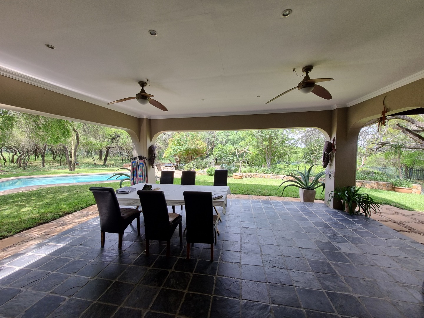 REMAX LISTING MOKOLODI 2 : Nestled within the esteemed Mokolodi 2, Gaborone, this magnificent 490 sqm residence, set on a sprawling 2.00-hectare plot, offers an unparalleled blend of rustic charm and sophisticated living. The property immediately captivates with its inviting covered entrance, featuring elegant stone-tiled steps and natural wood-framed doors and windows, all framed by lush, meticulously maintained gardens and mature trees that promise serene privacy and a picturesque kerb appeal.