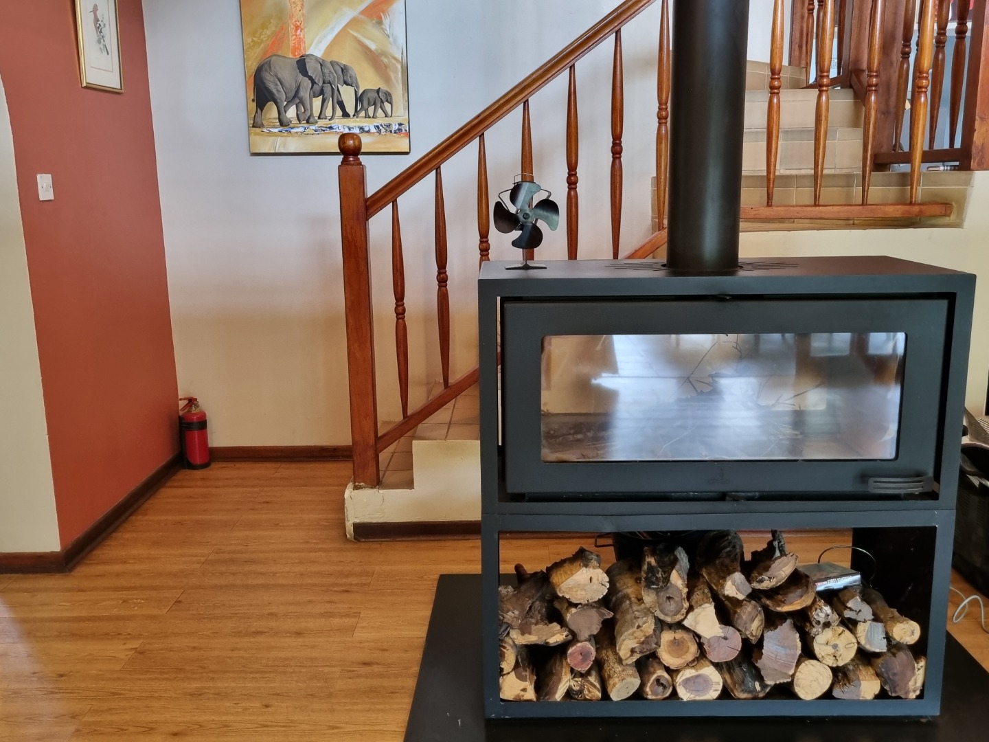 * Modern wood-burning stove plus fireplace