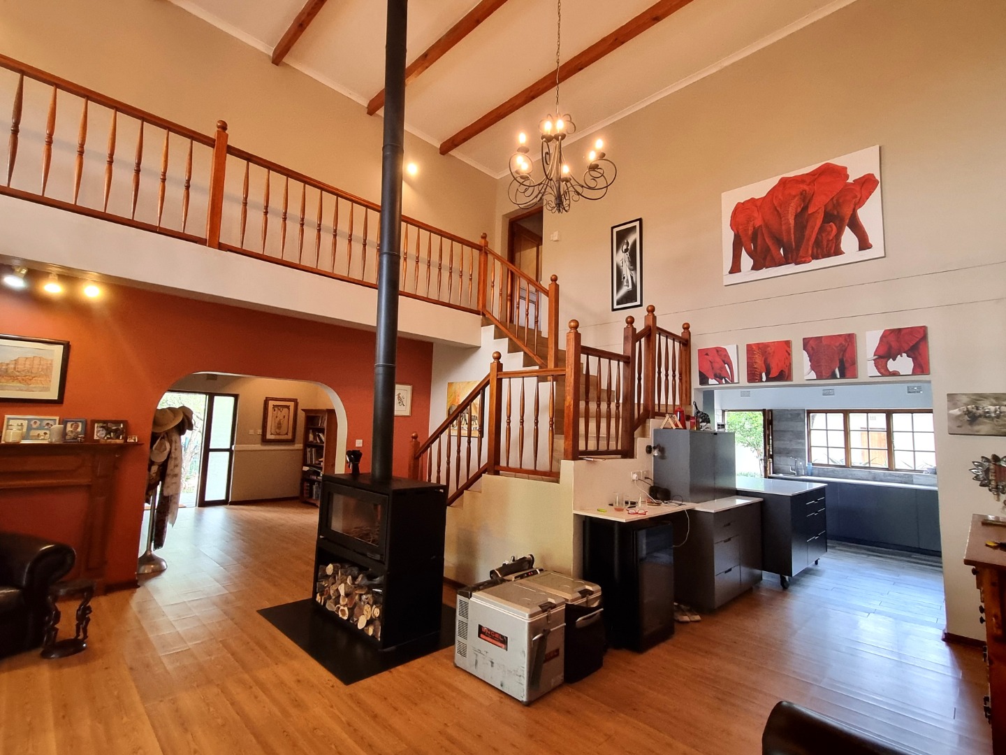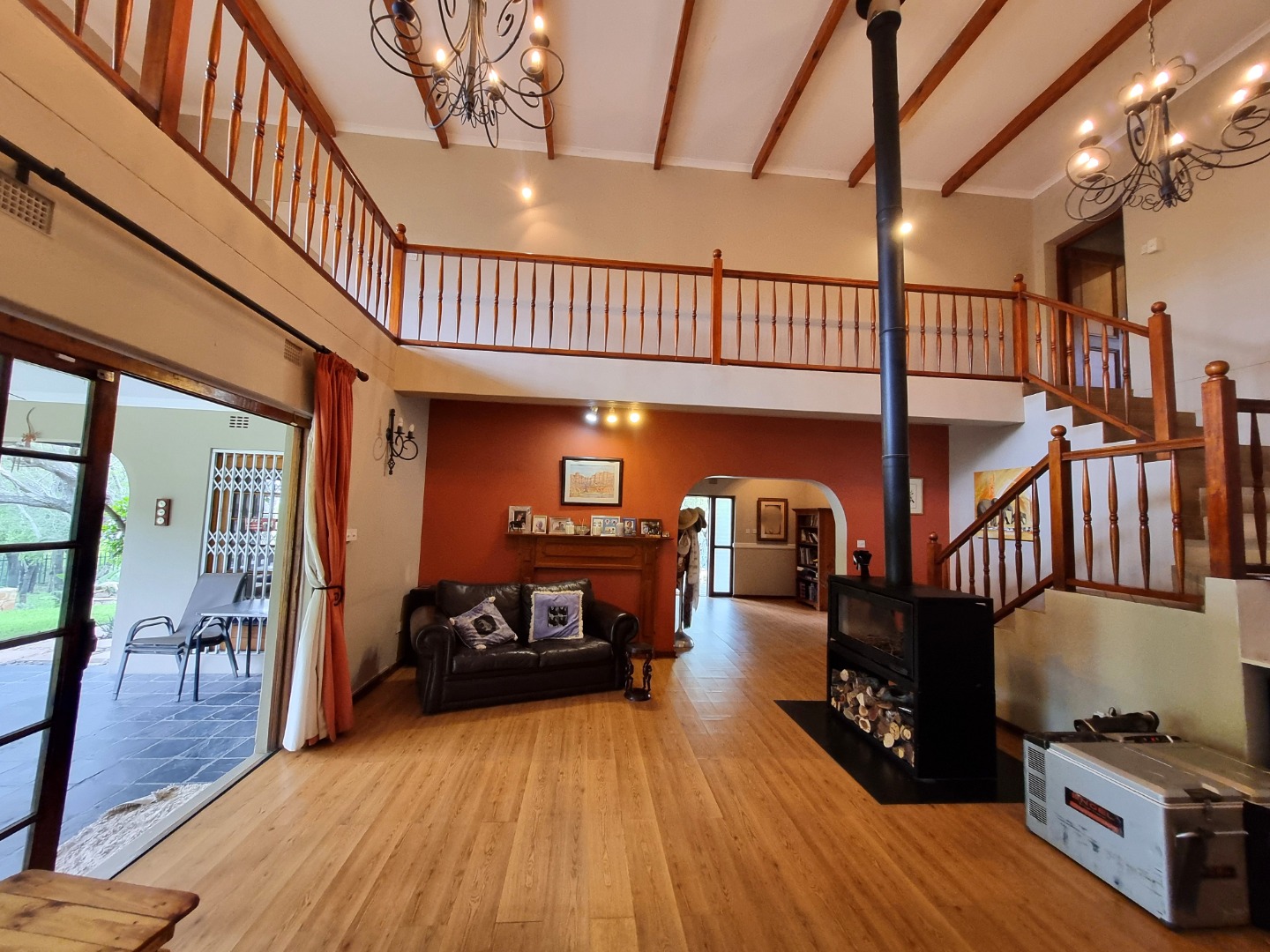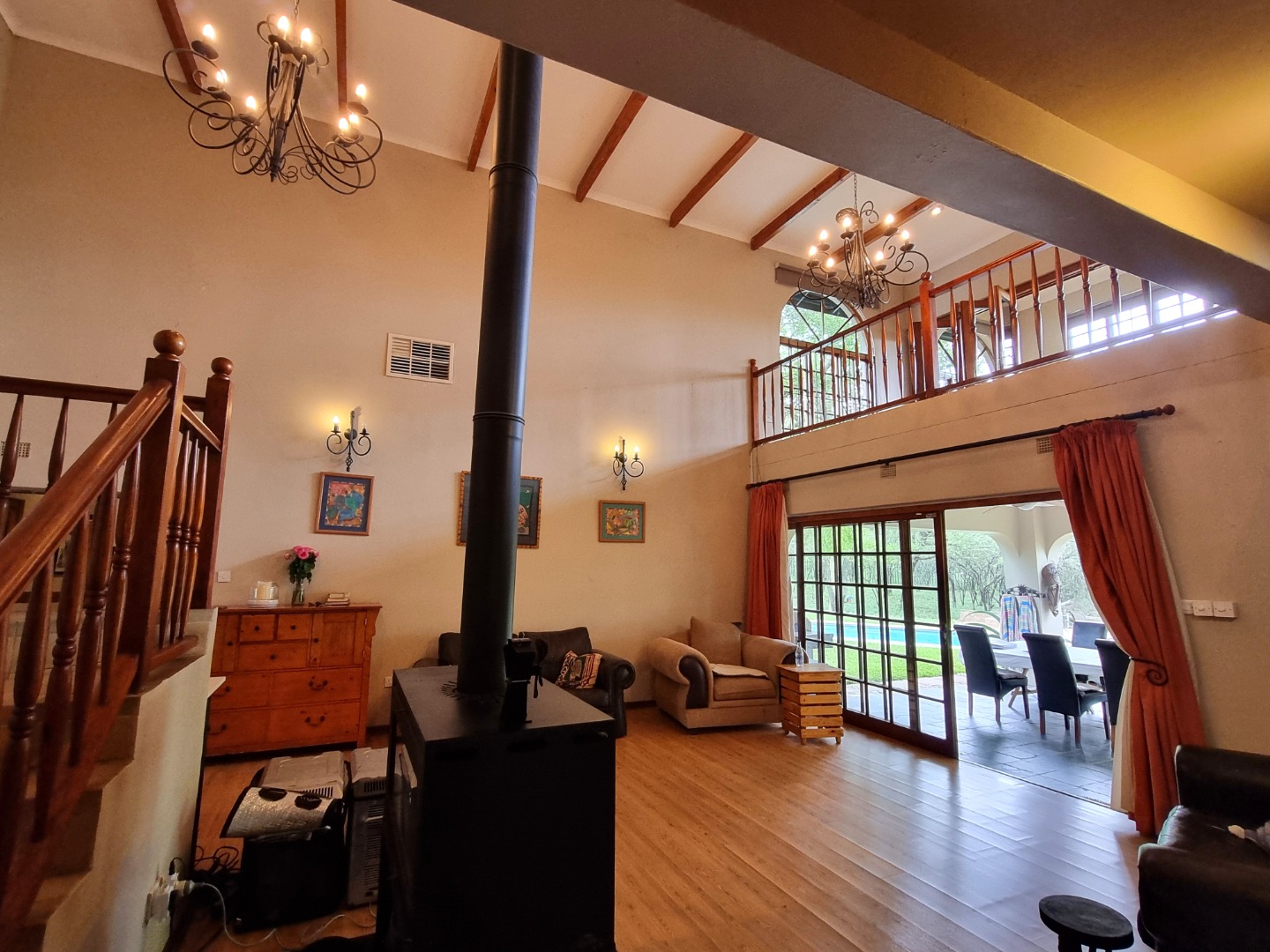 Step inside to discover an expansive open-plan interior designed for grand entertaining and intimate family moments. The heart of the home boasts high vaulted ceilings adorned with exposed wooden beams, creating an airy and majestic atmosphere. Light wood laminate flooring flows seamlessly through the two generous lounges and a dedicated dining room, leading to a large open plan loft/ living space where the 3rd bedroom is located. A modern wood-burning stove with integrated log storage provides a warm focal point, ensuring comfort during cooler evenings, while large sliding doors effortlessly connect the interior to the breathtaking outdoor oasis.