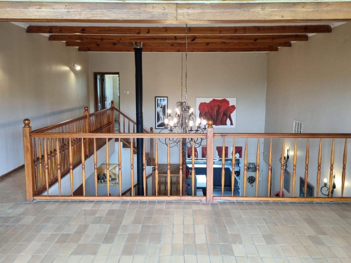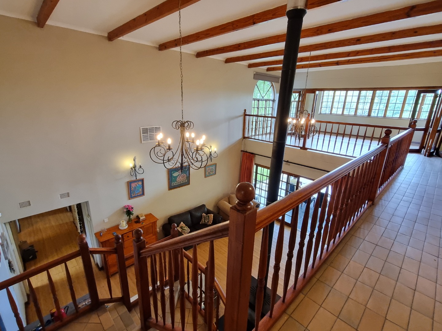 * High vaulted ceilings with exposed wooden beams