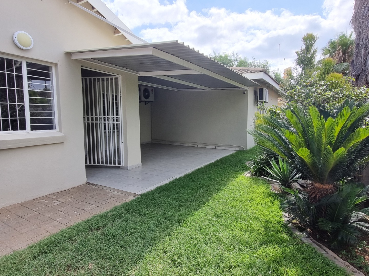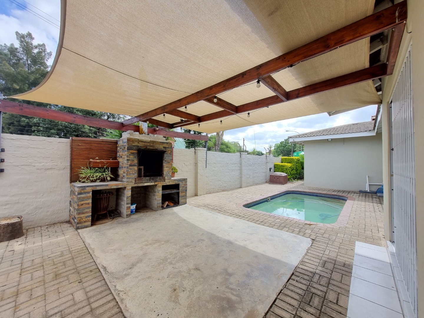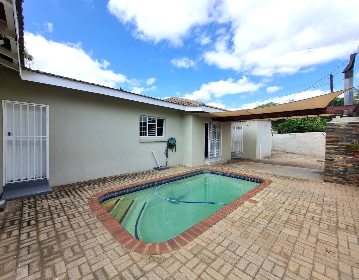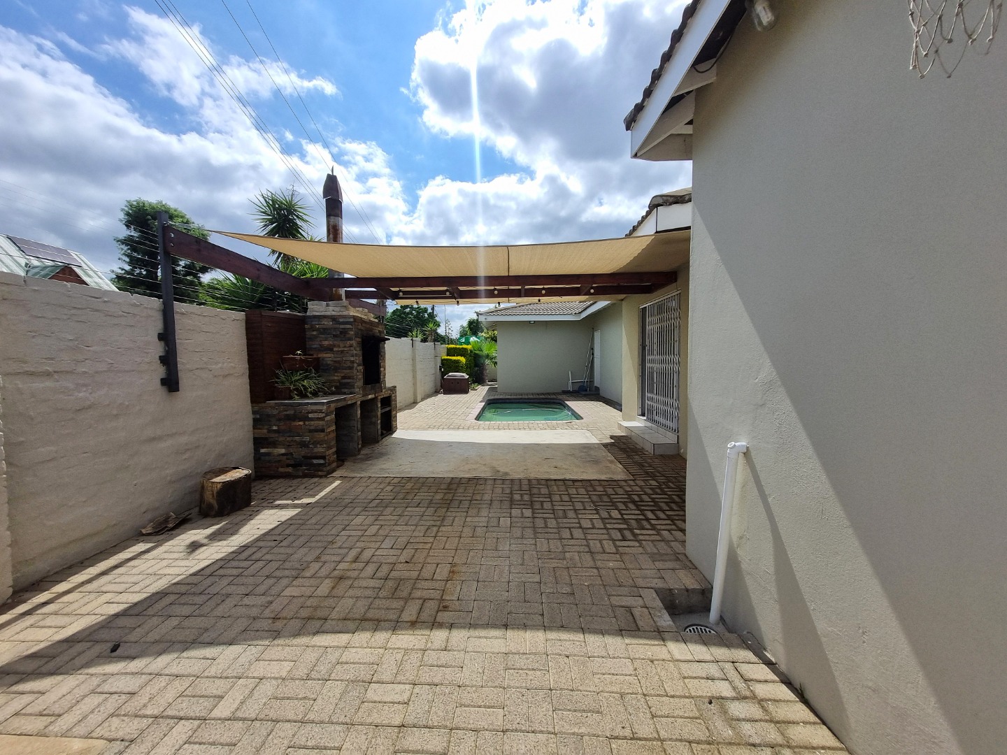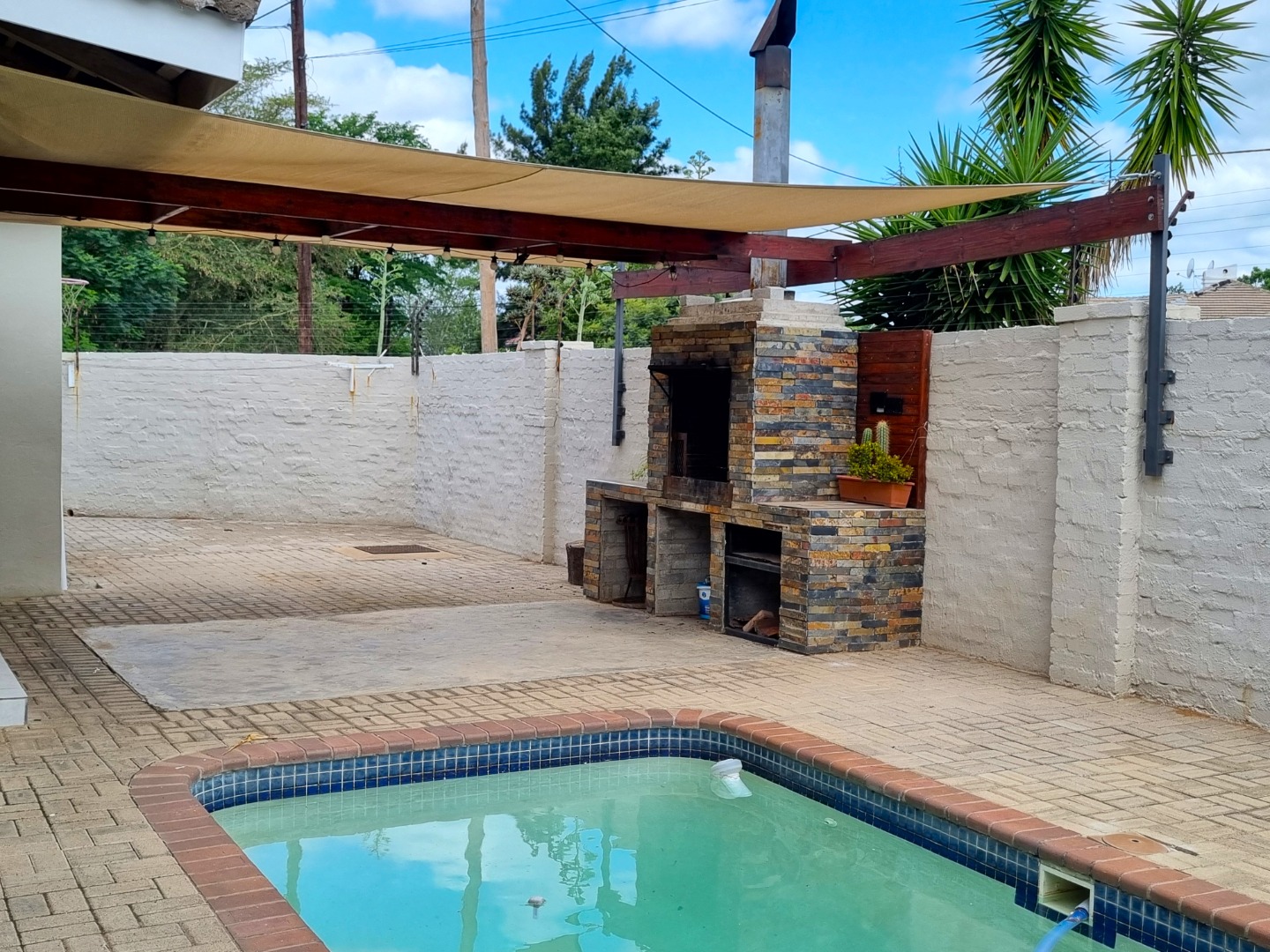 REMAX LISTING PHAKALANE: Available immediately. Immaculate home within a gated estate, offering a lovely light and bright lounge with fireplace, opening out to the entertainment bar area which leads out to the covered patio and the sparkling blue pool and the built-in-braai area. Perfect for entertaining and enjoying the outdoors and gatherings. The kitchen is well appointed with a scullery area, lots of storage and a handy breakfast counter opening into the dining area. There are 3 bedrooms, the master suite has its own ensuite bathroom and walk-in wardrobes; the other two bedrooms share the common bathroom and there is also a guest toilet. The study is really big and is well-fitted for convenience. There is a single garage, covered parking plus staff accommodation or guest wing, plus back-up water. This home has good security features all round and also has CCTV. Excellent home for a family available immediately, don’t hesitate. Call / WhatsApp Thalia 72575773.